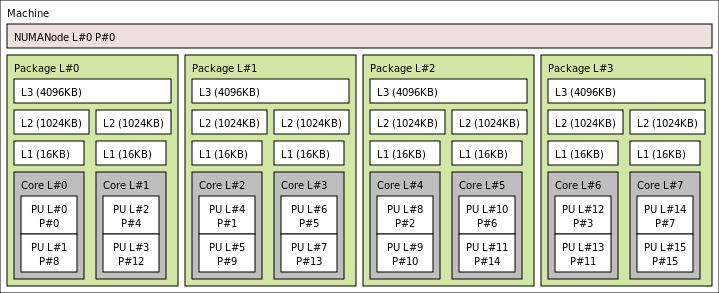 On a 4-package 2-core machine with hyper-threading, the lstopo tool may show the following graphical output: