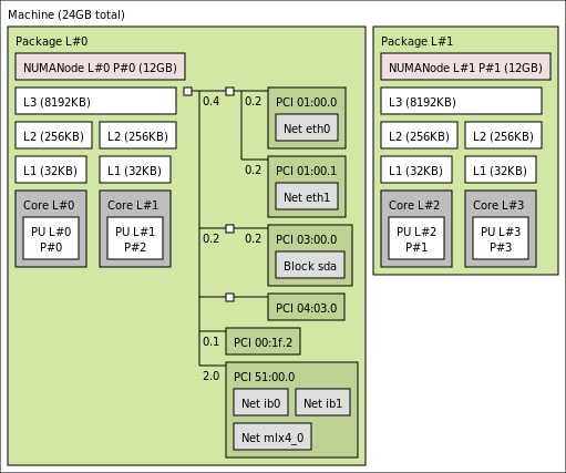 Six interesting PCI devices were discovered (dark green boxes). However, hwloc found some corresponding software devices (eth0, eth1, sda, mlx4_0, ib0, and ib1 light grey boxes) for only four of these physical devices. The other ones (PCI 04:03.0 and PCI 00:1f.2) are an unused IDE controller (no disk attached) and a graphic card (no corresponding software device reported to the user by the operating system).